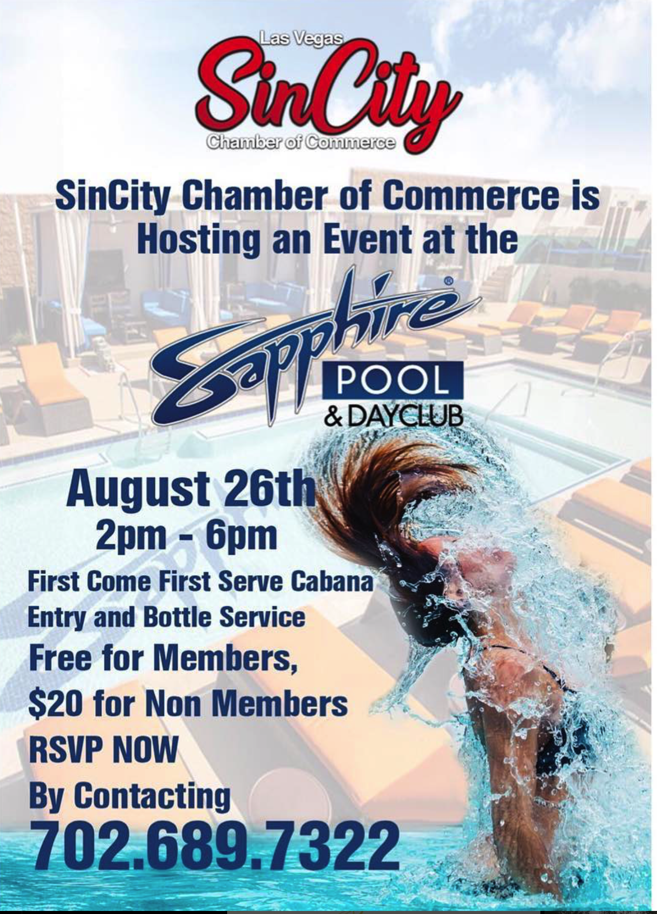 August 26th 2pm - 6pm First Come First Serve Cabana Entry and Bottle Service Free for Members, $20 for Non Members RSVP NOW By Contacting 702.689.7322